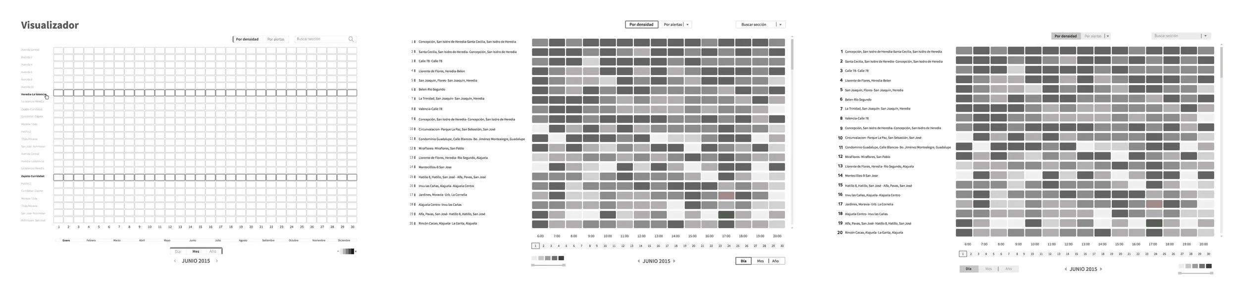After numerous color iterations, the team selected a color palette, considering that it should be pleasant for users who would spend a lot of time using the tool. At this point, we decided to move forward and implement a functional prototype using Javascript and a sample of one month's data from the SQL database.